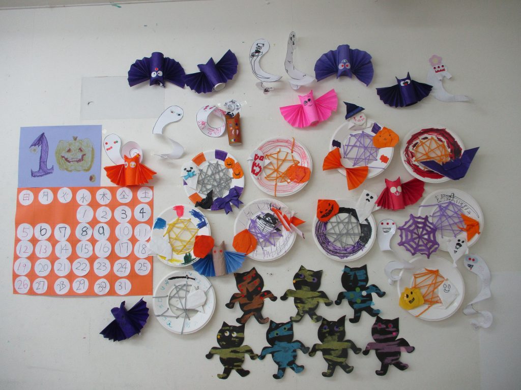 コウモリはトイレットペーパーの芯に折り紙を巻きつけ、羽を折り紙で作り、顔をシールで貼りました。耳の部分は折り紙が重なり形を整えるのが難しかったようですが、はさみ✂を使いながら折り方を工夫し、思い思いのコウモリを完成させていました。