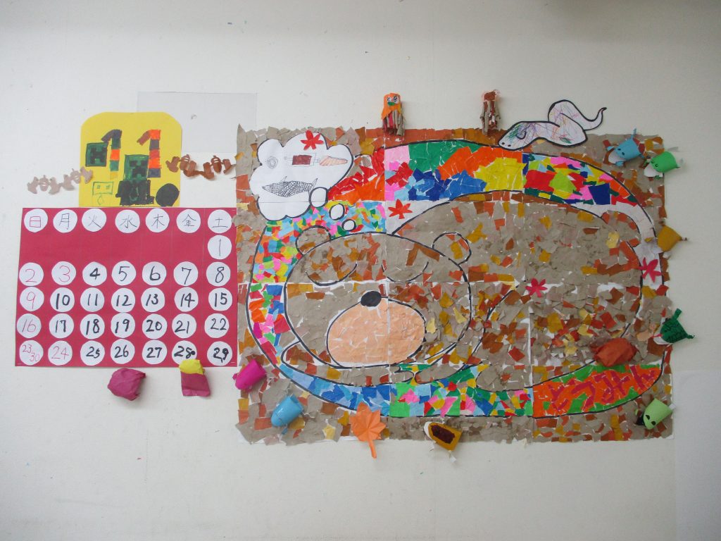 今月の壁面は冬眠後に食べたいものを思い浮かべながら冬眠💤に入る動物たちを作りました😄12枚のパーツを一人ずつ担当して、完成予想図を見ながら丁寧に貼ってみんなでおおきなちぎり絵にしました😤