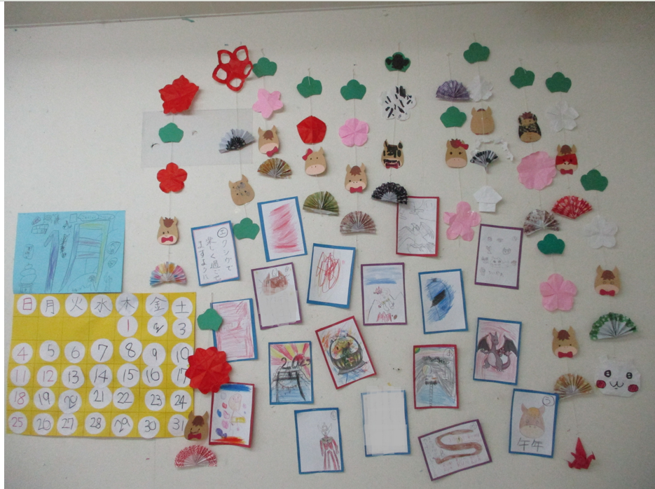 馬は顔にリボンとたてがみをノリでつけて作りました😊付ける向きや場所でそれぞれの馬の個性が現れています👏梅の花や松は色紙を折る、切る工程を丁寧に進めることが皆さん上手に作ることが出来ていました✄