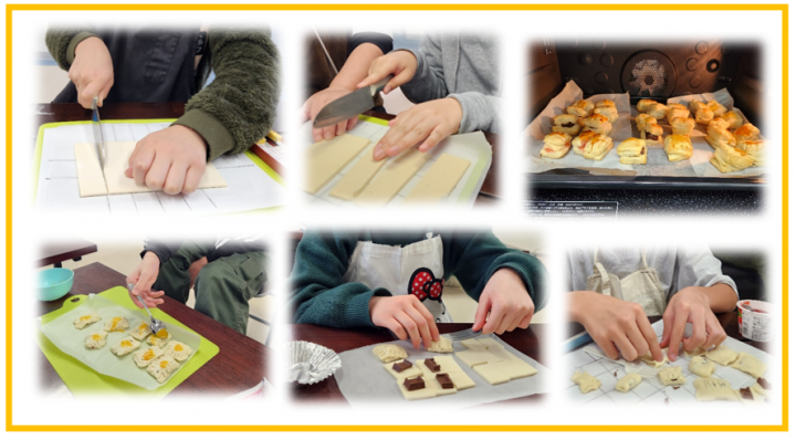 中にチョコ・いちごジャム・ブルーベリージャムをはさみました(⌒∇⌒) 限られた作業工程で、取り組みやすかったようです✨具材をはさんだ後に卵黄をしっかり塗り、焼き上がりはこんがりと色がついていました♩美味しく出来上がってよかったです😋
