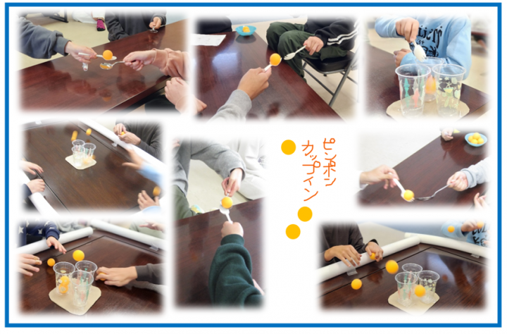 今回はチーム戦で、ピンポン玉をスプーンでパスしながらカップに入るタイムを競うものと、カップをめがけて投げるピンポン玉が全部入るタイムを競うものを行いました📣