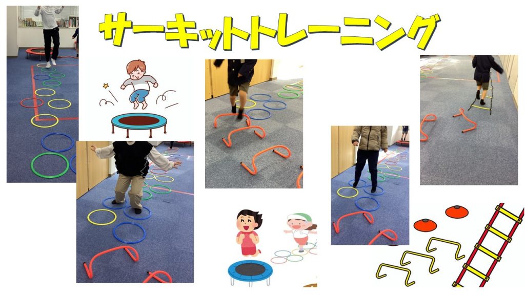 サーキットトレーニングでは、ラダーを使ったステップ運動やトランポリン、フラフープを使ったケンパなど、さまざまな運動を組み合わせて行っています😊