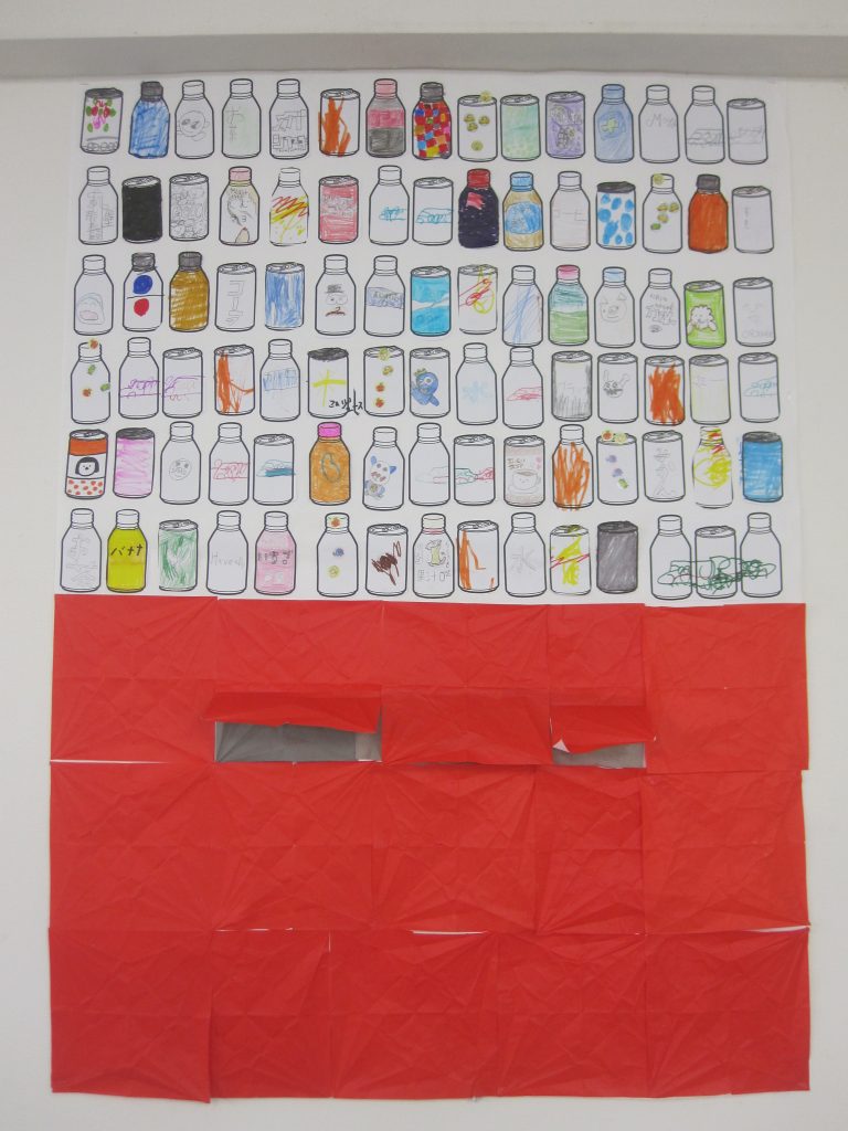 大きな模造紙を自動販売機に見立て、赤い折り紙を貼ったり、取り出し口のようにめくれる仕組みを作ったりと、色々なアイデアを出し合いながら制作を進めました🍹