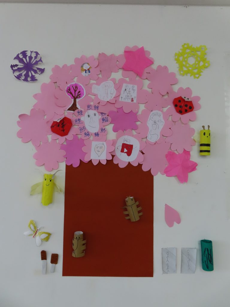 大きな木の幹を中心に、折り紙で作った花やさまざまな飾り、絵や似顔絵を描いた桜など、一人ひとりが思い思いに工夫しながら制作する姿が見られました。